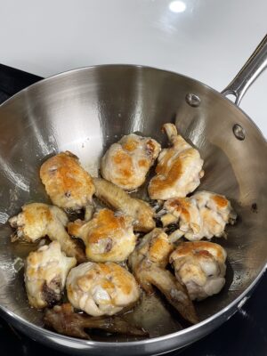 Hạ nhỏ lửa, cho từng miếng gà vào.